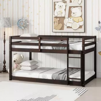 Twin Over Twin Low Bunk Bed with Ladder and Guardrails for Kids